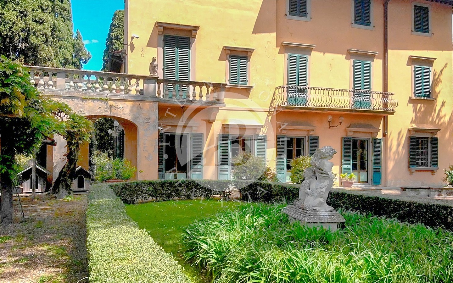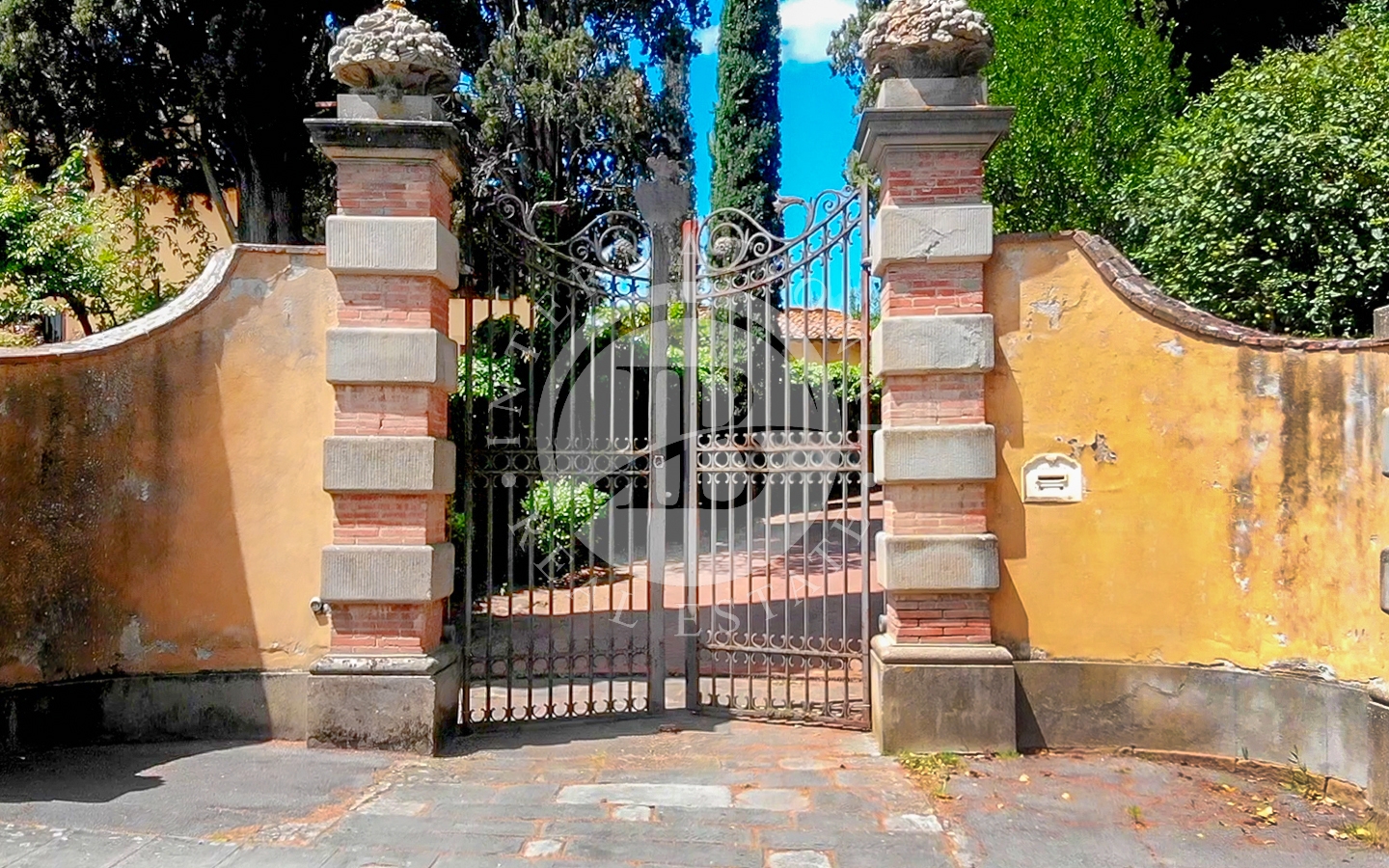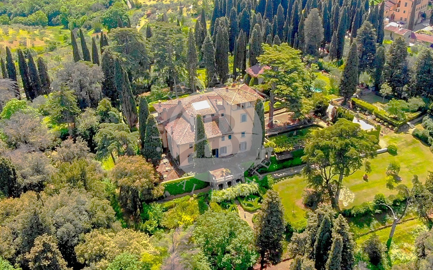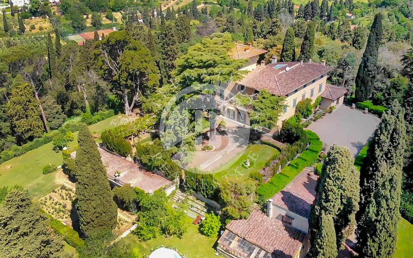 La proprietà comprende la villa principale, una casa del custode, la casa del giardiniere con serra e l’elegante Orangerie affacciata su un giardino all’italiana.Gli spazi esterni sono impreziositi da percorsi nel bosco e da alberi secolari, cipressi e palme, oltre a profumati roseti, glicini e gelsomini. È presente anche un campo da tennis.