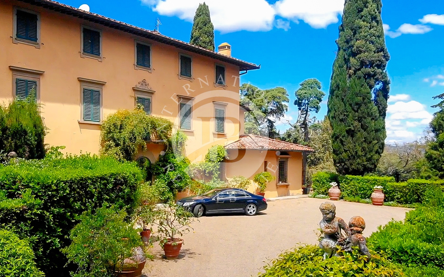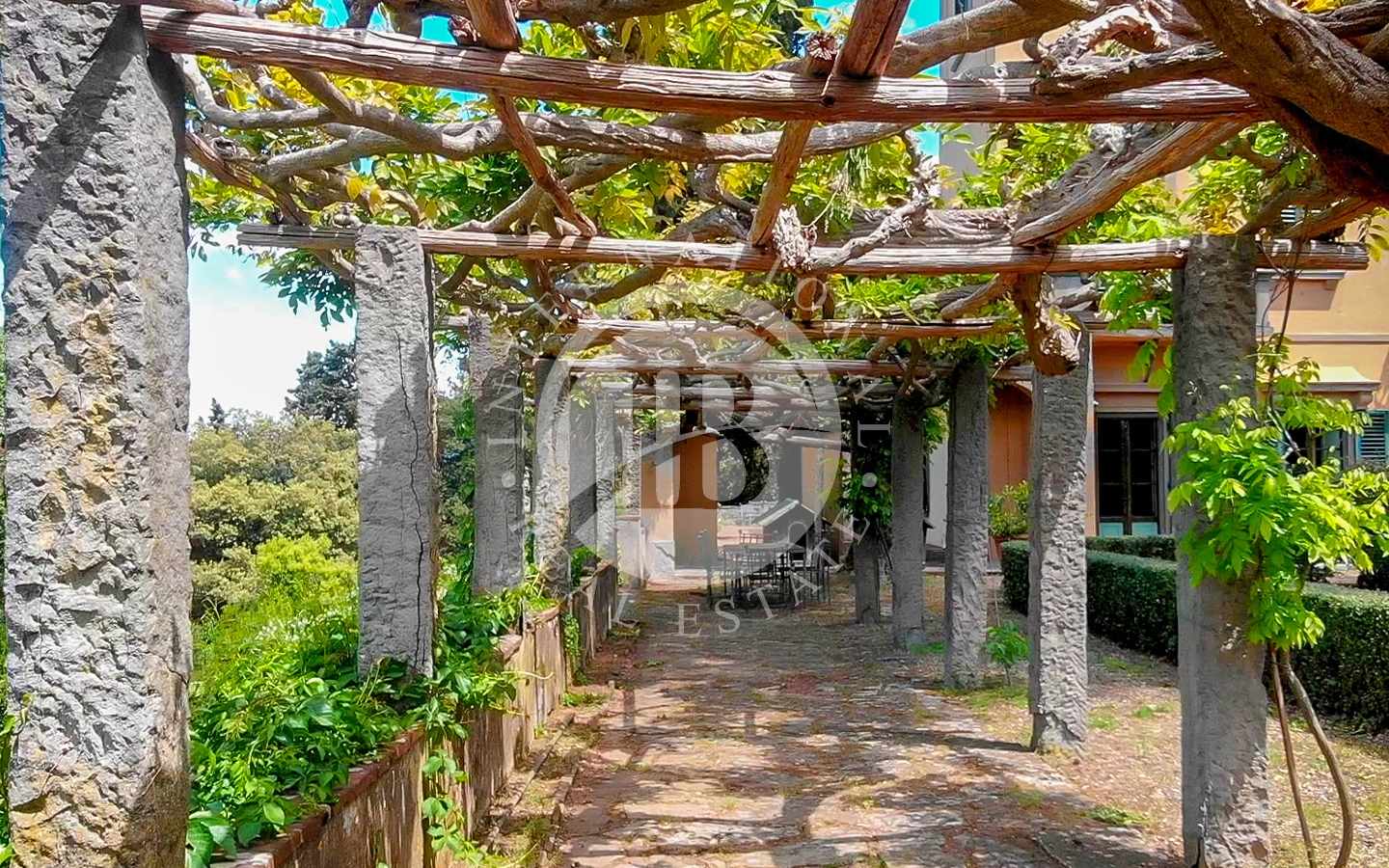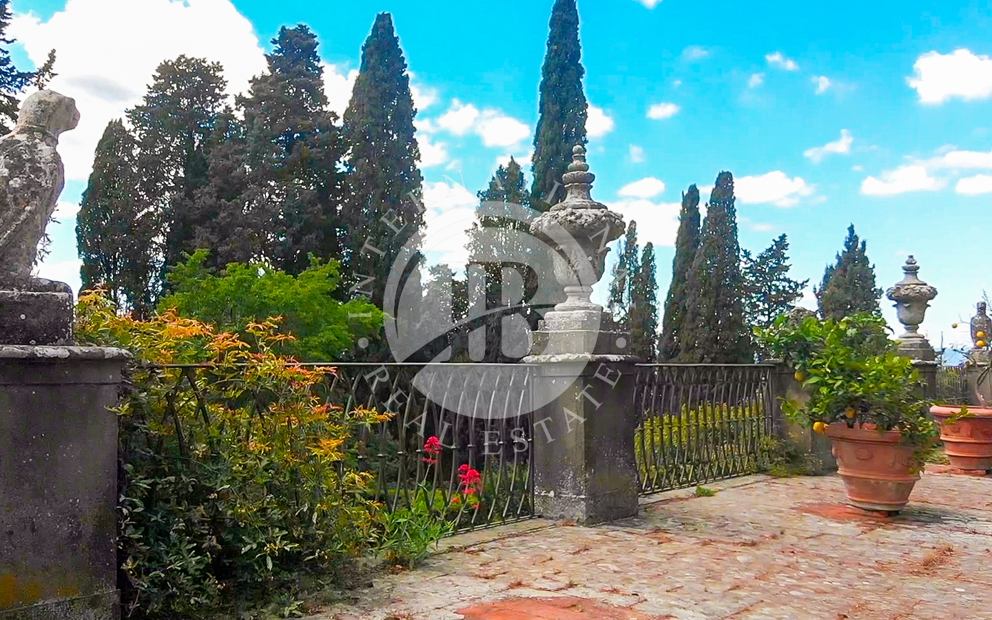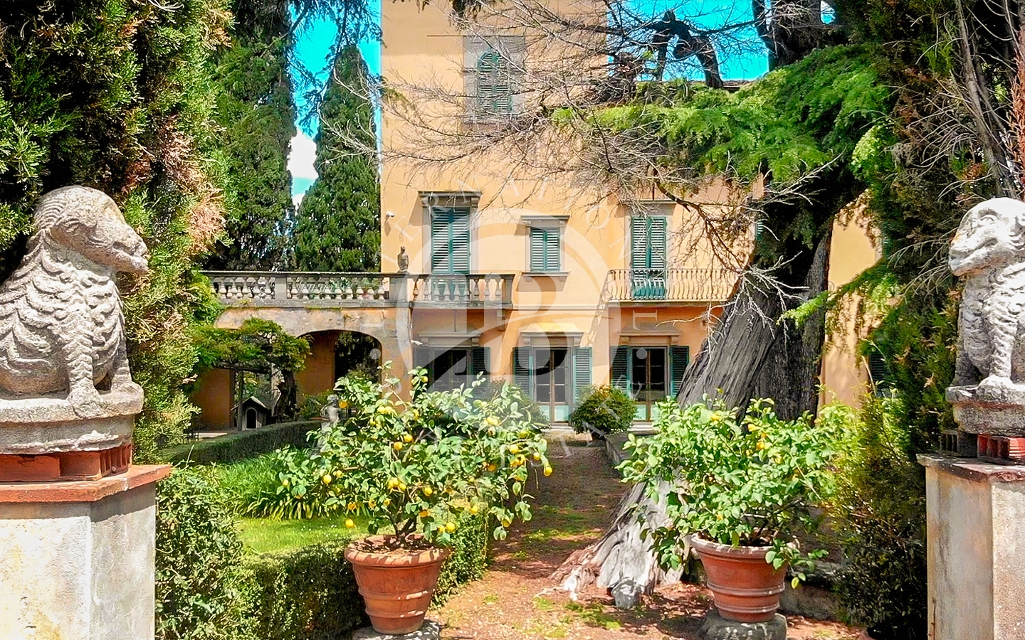 La proprietà comprende la villa principale, una casa del custode, la casa del giardiniere con serra e l’elegante Orangerie affacciata su un giardino all’italiana.Gli spazi esterni sono impreziositi da percorsi nel bosco e da alberi secolari, cipressi e palme, oltre a profumati roseti, glicini e gelsomini. È presente anche un campo da tennis.