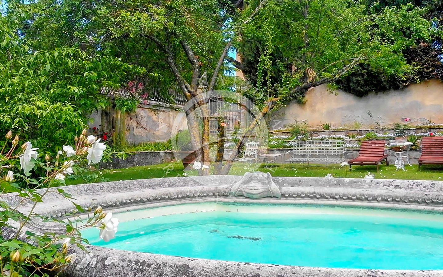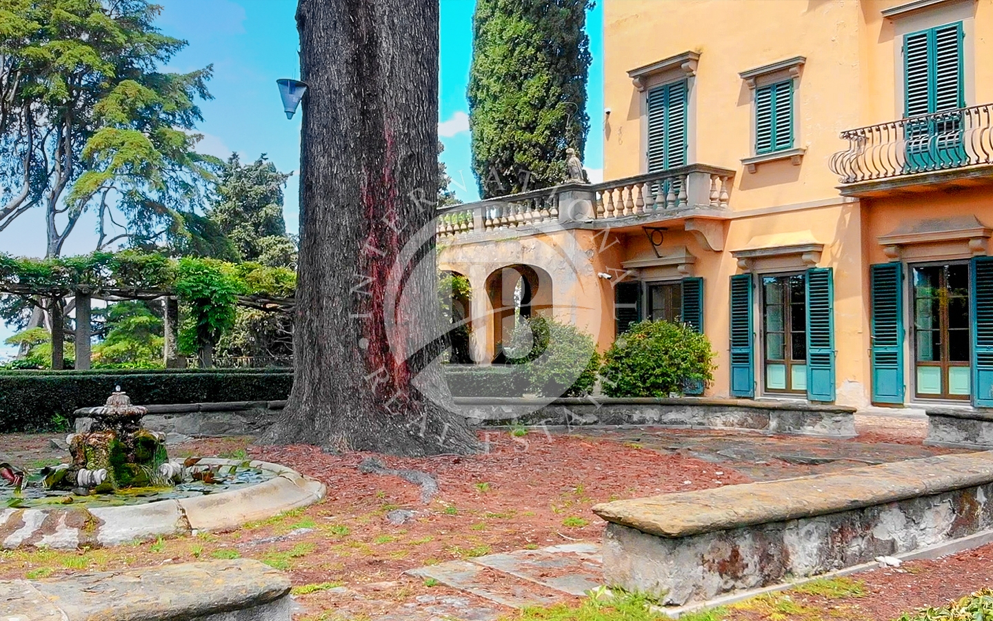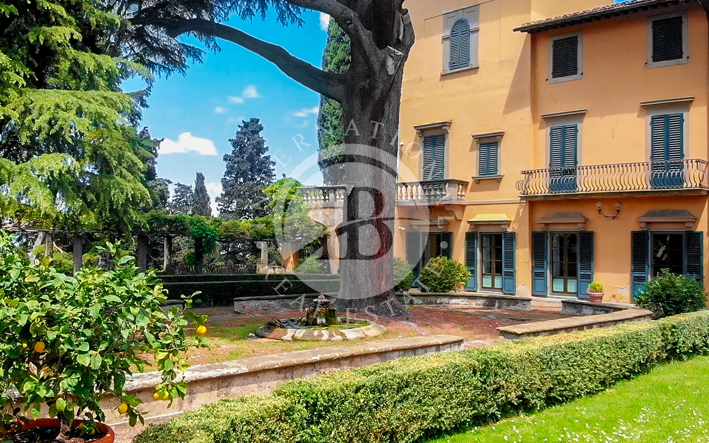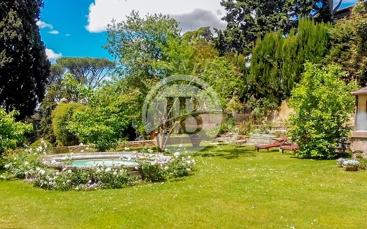 La villa, vincolata e risalente al 1400, è circondata da un ampio parco privato e da splendidi giardini, arricchiti da laghetti, fontane, statue e terrazzamenti progettati dal celebre architetto Cecil Pinsent negli anni ’20.