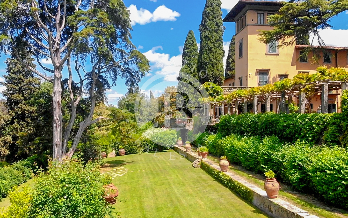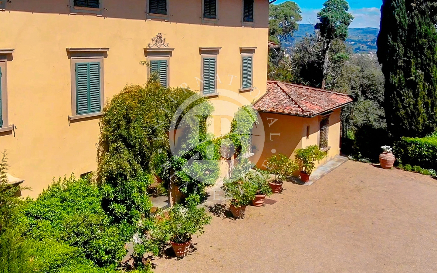 La villa principale, sviluppata su tre piani oltre alle cantine e al suggestivo torrino, si compone di ampi e luminosi ambienti, con soffitti in legno, camini in pietra e balconi con vista sui giardini e sulla città. Al piano terra si trovano aree living, salone, sala da pranzo, cucina principale e cucina originale con camino e forno a legna. Il primo piano ospita la zona padronale con biblioteca, camere da letto e bagni, mentre il secondo piano offre ulteriori camere da letto, bagni e un soppalco, fino al torrino panoramico con vista a 360° su Firenze.