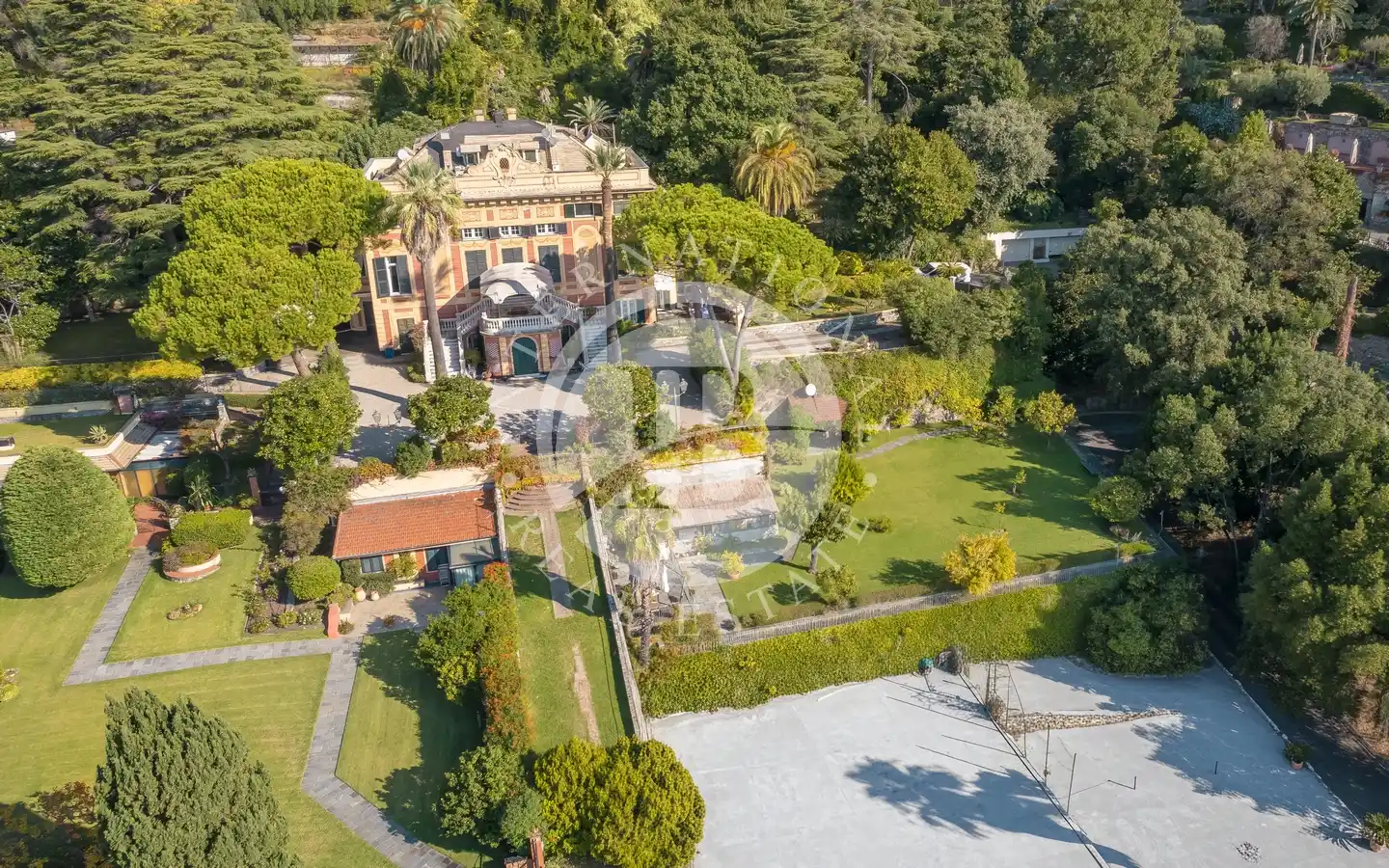 Le abitazioni sono circondate da ampi spazi esterni costituiti da giardini ben curati con infinity pool riscaldata vista mare dotata di bagno e spogliatoio riservati e un ampio parco. Nel parco è presente un’area privata per campo da tennis attualmente non utilizzato. Il viale d’accesso alle proprietà è privato.