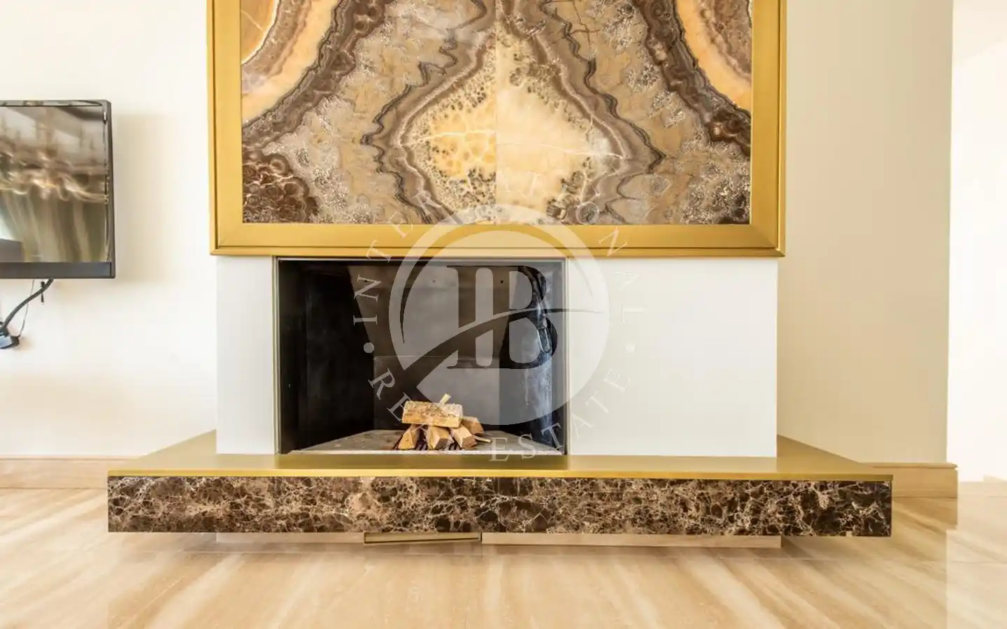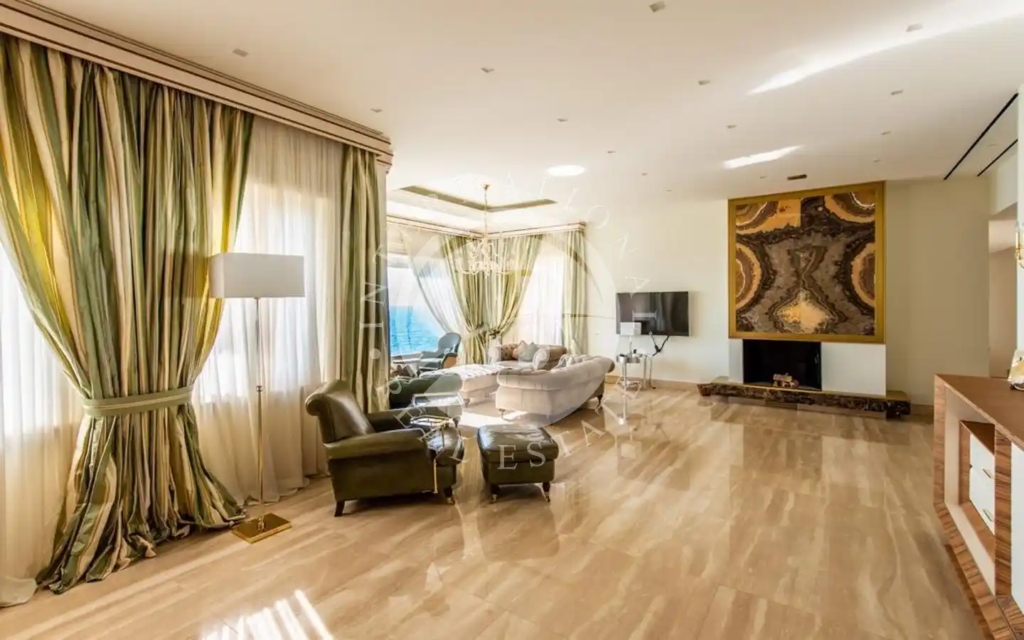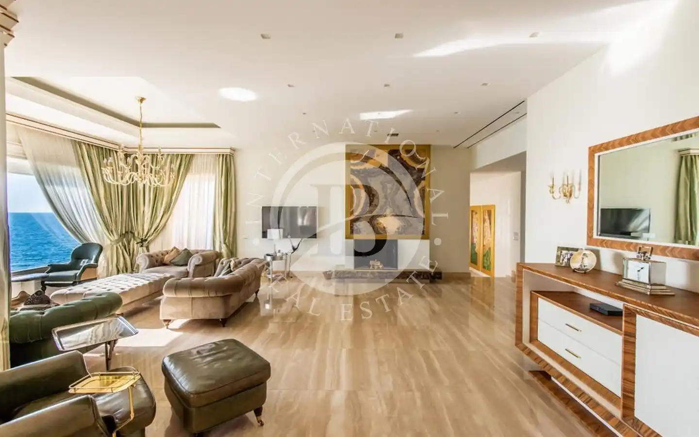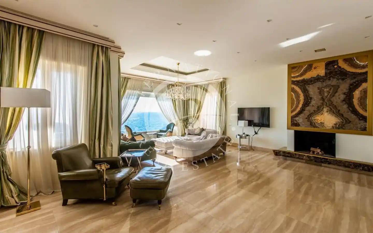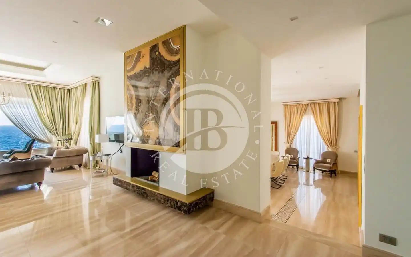 Основная вилла площадью около 500 кв.м расположена на нескольких уровнях. На первом этаже просторный вход ведёт в большую гостиную с камином и панорамными окнами с видом на море, кухню с зоной для завтраков и представительскую столовую. Отсюда осуществляется выход на большую террасу с видом на море, крытым портиком, лаунж-зоной и открытым бассейном — идеальное пространство для отдыха с видом на залив.